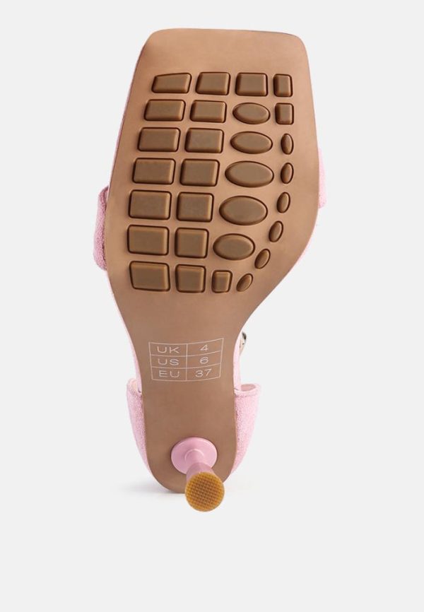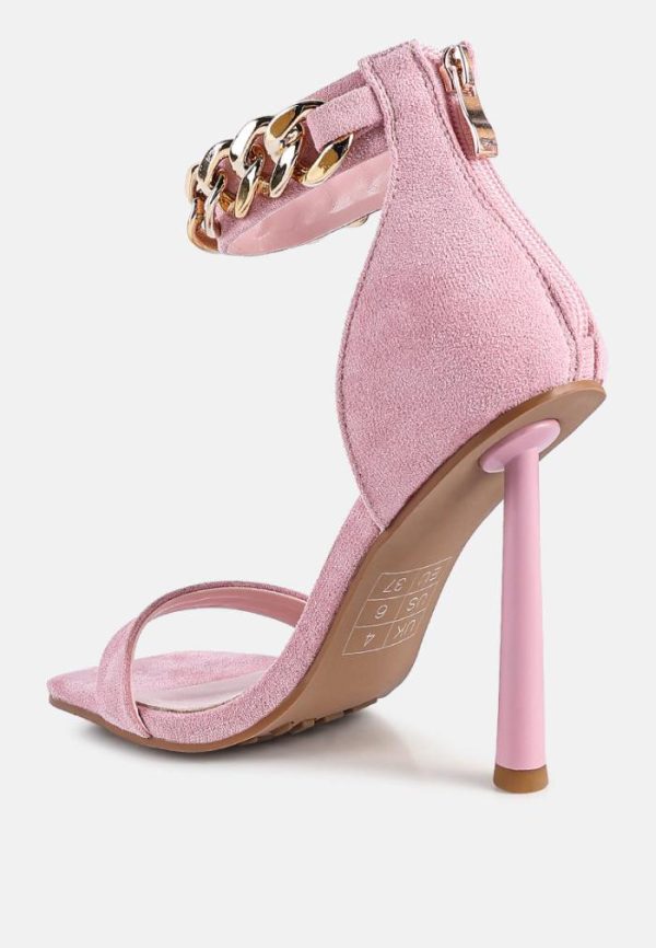The luxurious, thin, high, cylindrical heeled sandals, made from micro suede, feature a trendy metallic chain detail on the ankle band. They have a convenient back zipper opening and a square-toe design. Plus, they come with light cushioning for added comfort.
