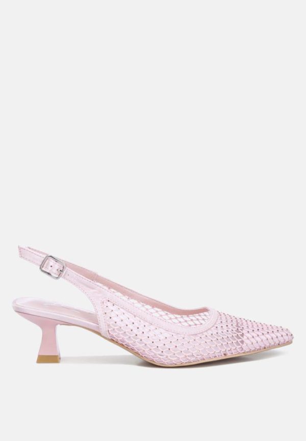 Stunning sling back heels with rhinestone details, a pointed toe, and a feminine kitten heel make this pair stand out in your shoe closet for all the right reasons!